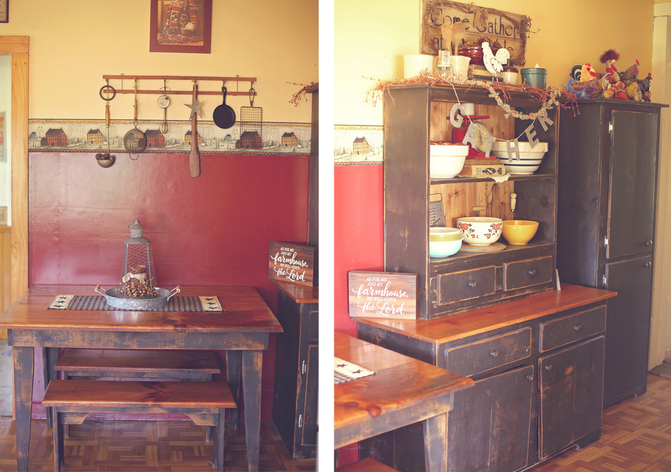 I’m also very fortunate to have a local husband and wife team that builds this gorgeous primitive furniture. I have many, many of their pieces in my house. They built my kitchen table with matching benches, the hutch and the cupboard to the right of it. I absolutely love their pieces!