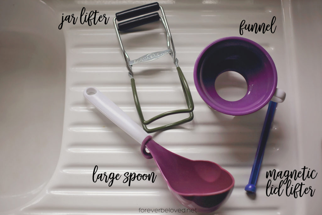 Gather up the rest of your tools that you’ll need. You’ll need a funnel, magnetic lid lifter, a jar lifter and a large spoon. Most hardware stores, and even WalMart, have canning kits. The kits will have most of the supplies pictured below in them.