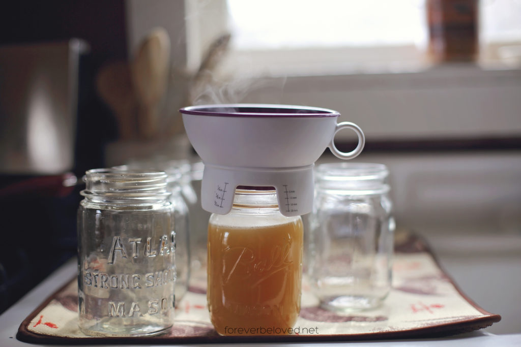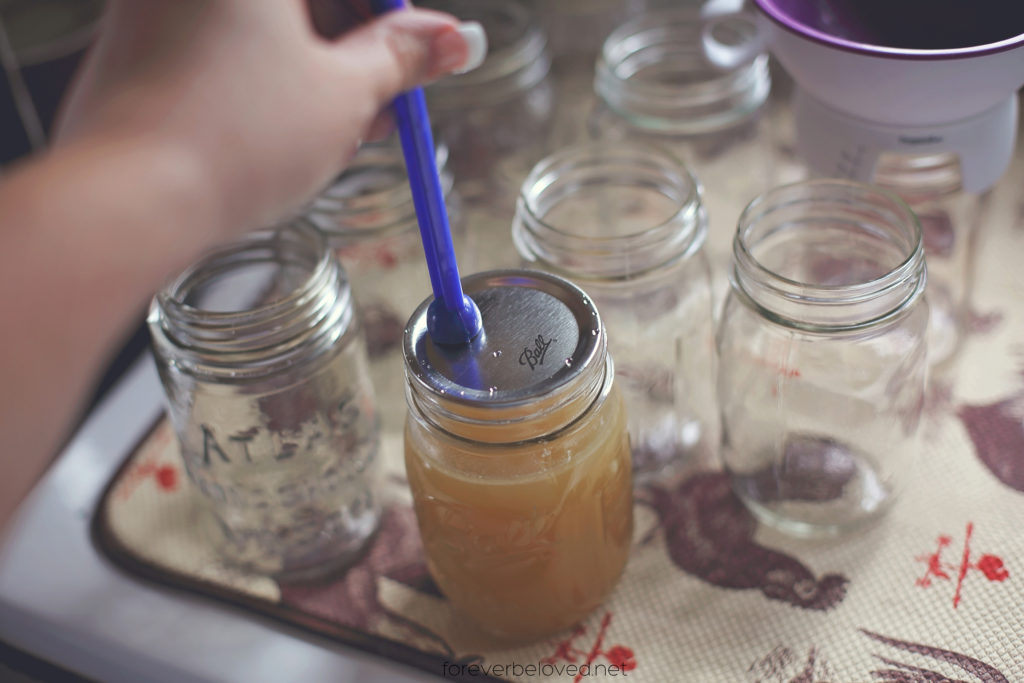 Fill your jars with hot broth. Make sure you have 1″ headspace between the broth and the rim of your jar. In canning, headspace is the amount of space you leave between the rim of the jar and whatever you’re filling it with. Each thing requires a different headspace. I found this handy dandy funnel that also has markings on the side to measure headspace. Here is a little headspace chart to follow:
