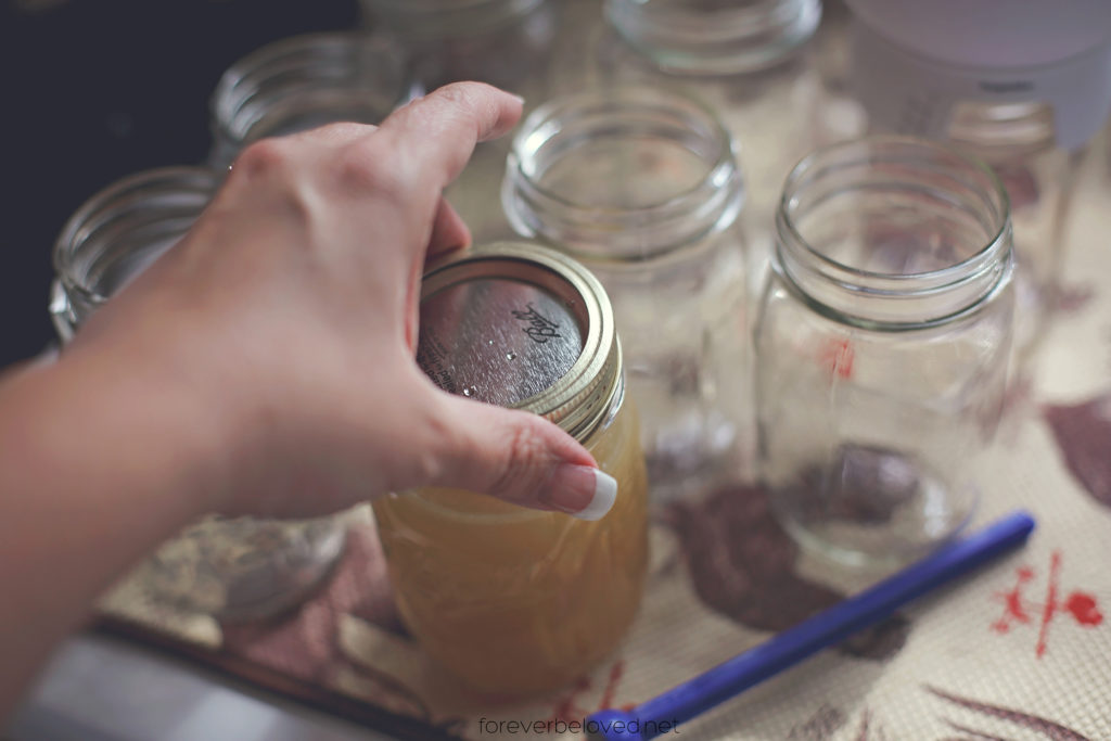 Put your ring on and finger tighten. I use a towel or hot pad to hold onto the jar so I don’t burn my hand. Don’t over tighten your rings. Also, once the jars are sealed and cooled you can remove the rings. The lids are what keeps the jar sealed.
