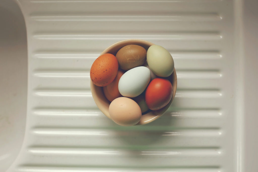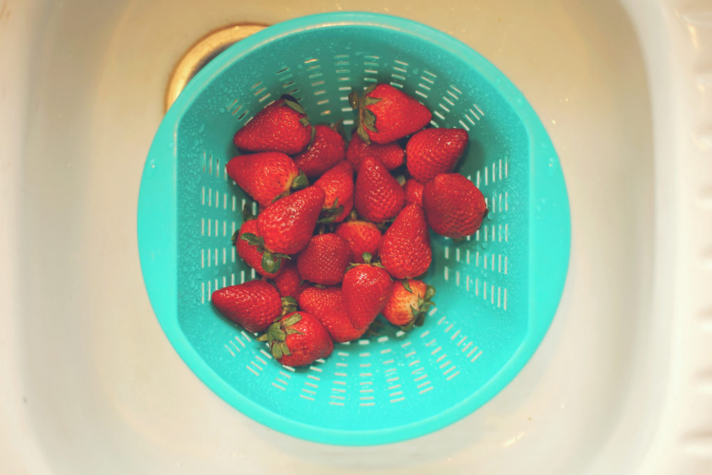 First I washed the fruit very well. You could use an all natural produce wash if you want, I just used water for mine. You don’t need to dry them, since they’ll dry in the dehydrator anyway. Just realize working with dry fruit is easier and less messier than working with wet fruit. Cut the stems off of each strawberry and set them aside. If you have chickens (or a rabbit that lives in your house) they love these strawberry tops!