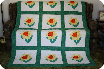 this is my pic of the day for yesterday…when my grandma moved in with my mom they found quilt squares that she hadn’t ever made into a quilt. my cousin sue took them and brought this finished product back to grandma last weekend, isn’t it gorgeous??? all hand stitched…and such a wonderful part of heritage to pass down through the generations. i am a sucker for quilts, i love them. i have ones that my grandma strong made as well…i wish i had the patience (and ability) to quilt…
