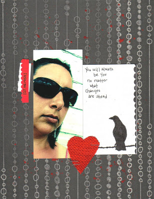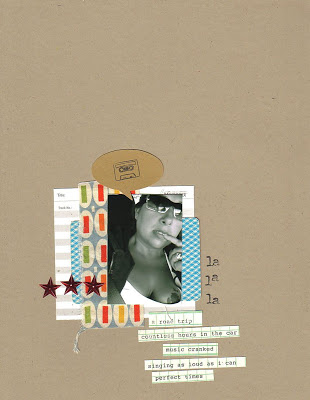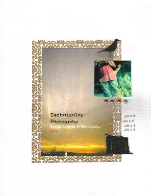 this one is kinda hard to see as it’s on white cardstock…i am just in LOVE with the postcards that came with this kit! in the layout above, the girl was cut out of the postcard. and the postcard in the center of the layout below also came with the kit.